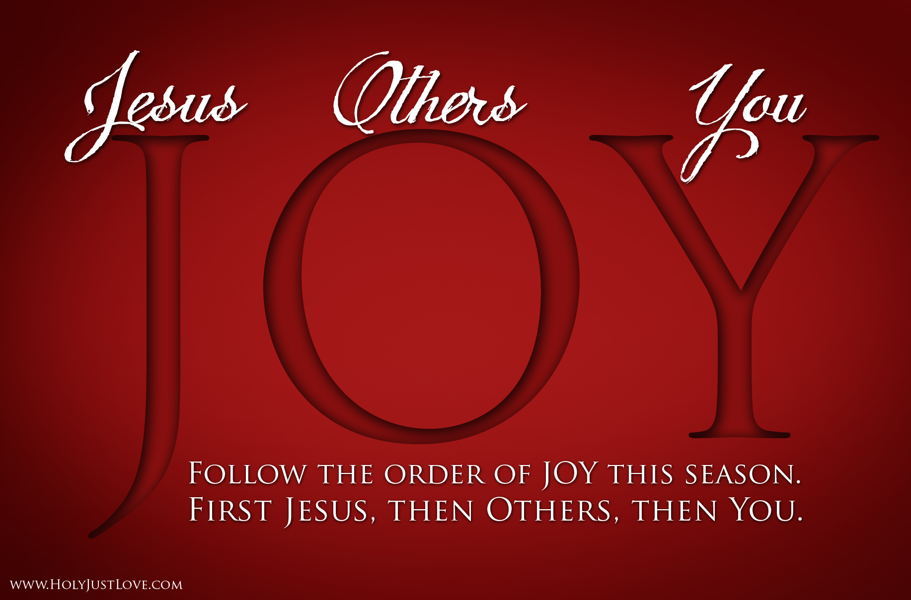 Follow the order of JOY this season. First Jesus, then Others, then You. Posted on December 4, 2013 by Jen O'Sullivan 0 Follow the order of JOY this season. First Jesus, then Others, then You. Share this: Click to share on X (Opens in new window) X Click to share on Facebook (Opens in new window) Facebook Click to share on Pinterest (Opens in new window) Pinterest Click to email a link to a friend (Opens in new window) Email Like Loading... Related